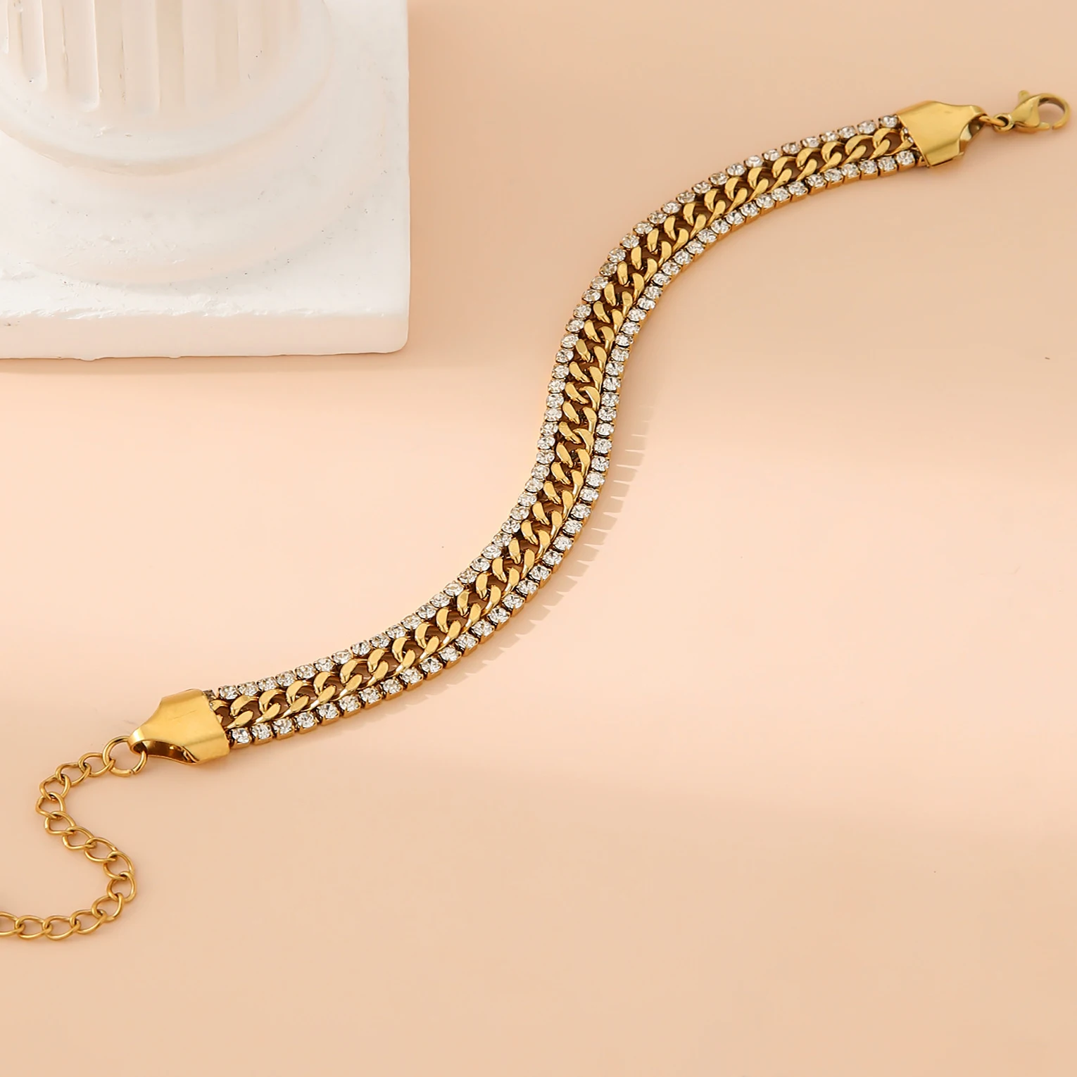Layer eternity with the Aurelian Eon Cuff—a symphony of light and longevity designed for sensitive skin and bold expression. Meticulously crafted in medical-grade 316L stainless steel and plated with 5μm of 18K gold, this adjustable bracelet features a seamless curb chain embedded with 21 precision-cut cubic zirconia. Each stone is tension-set to appear suspended in midair, refracting diamond-like fire against skin.