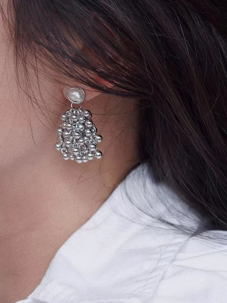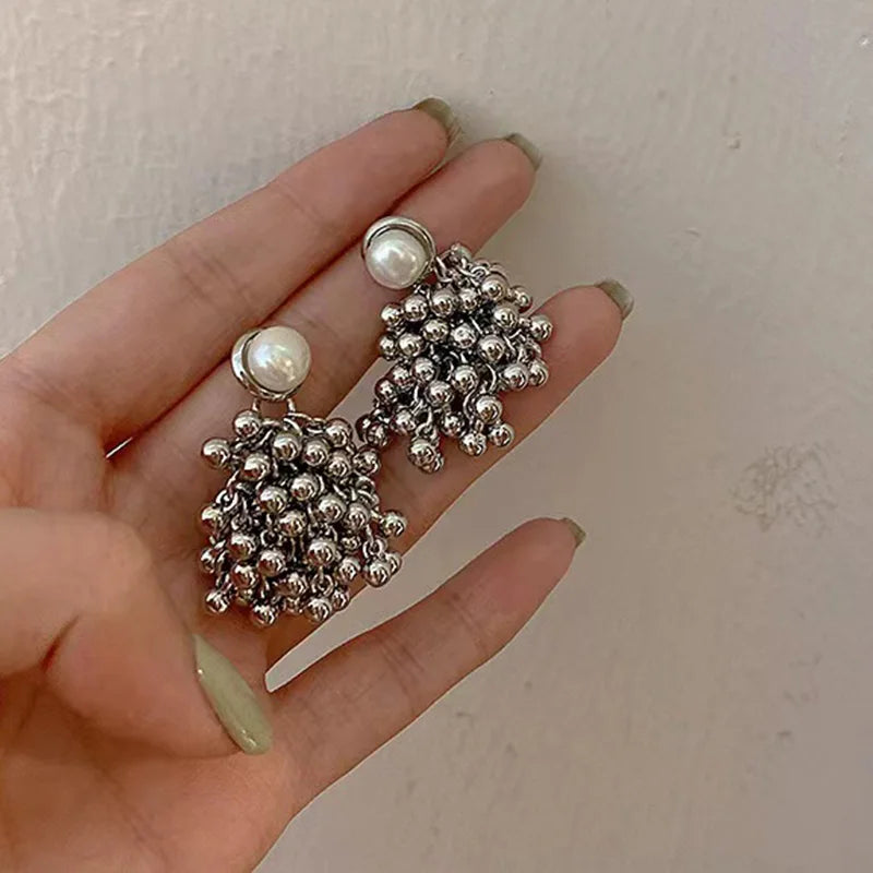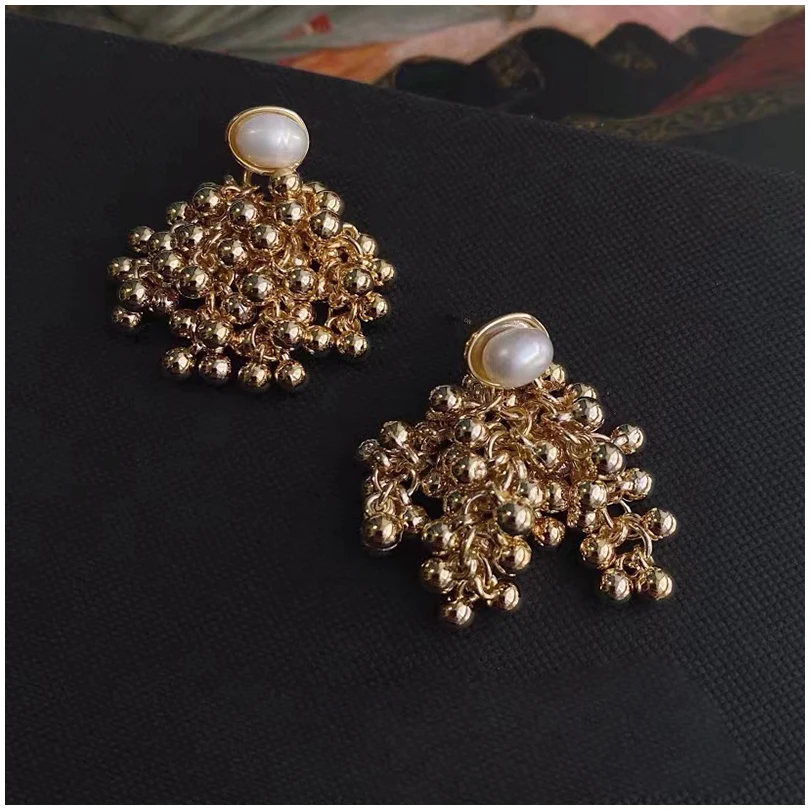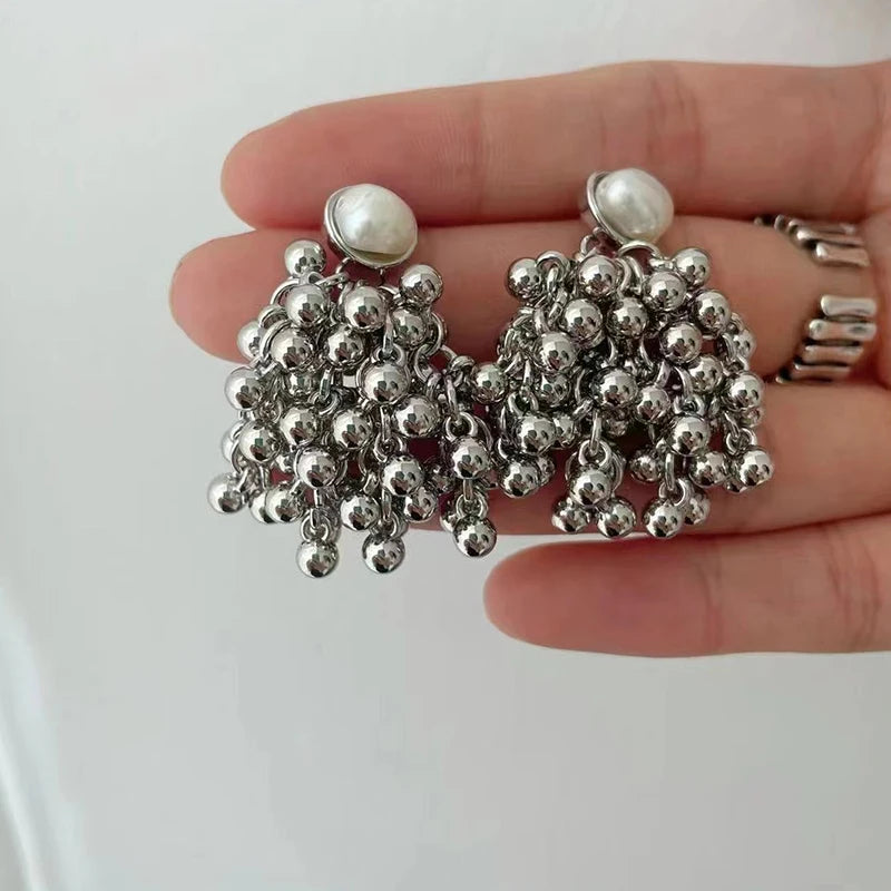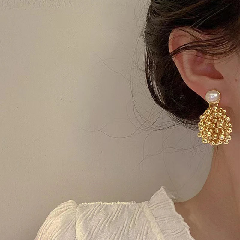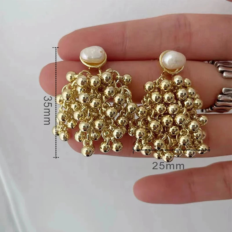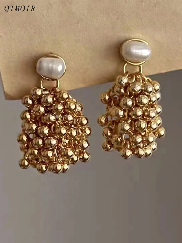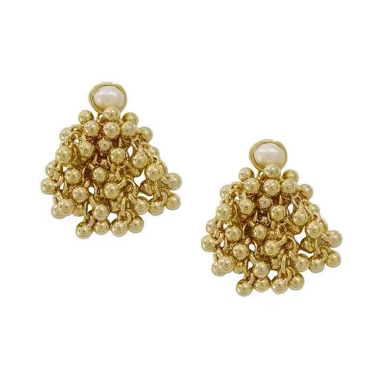 Draped in moonlit poetry, the Luminous Nocturne Clusters reimagine vintage glamour. Hand-assembled from antiqued gold-plated brass, these earrings cascade creamy freshwater pearls and polished metal beads in asymmetric clusters, evoking heirloom treasures rediscovered in a Parisian atelier. Delicate chain tassels sway with every turn, catching light like dew on cobwebs at dawn.