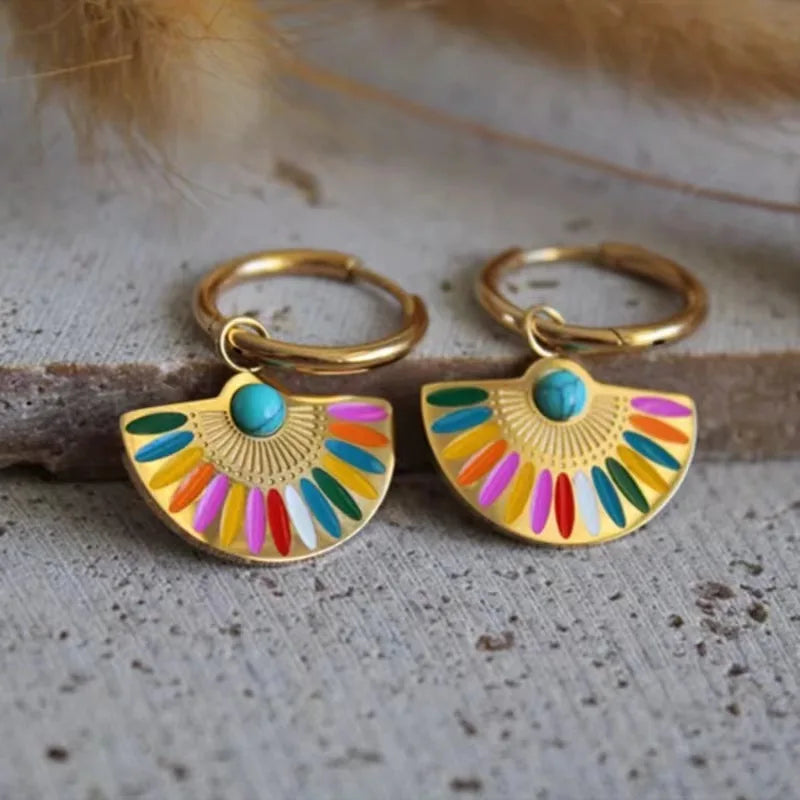 Wear the alchemy of light and ancient craft. The Lumière Arcane Sunbursts feature hand-poured vitreous enamel fused onto surgical stainless steel, radiating in seven spectral hues (indigo to vermilion) within precision-cut geometric fans. Each "petal" showcases gradient enamel pools bordered by 18K gold-plated edges, suspended from fluid hoop silhouettes that sway like captured rainbows.