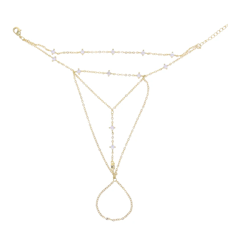 Bold and elegant, the Aurora Finger Bracelet features layered chain links paved with shimmering CZ stones. Crafted in radiant gold tones, it seamlessly connects ring to wrist—perfect for parties, gifts, or statement style.