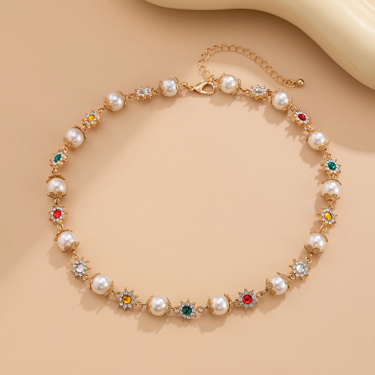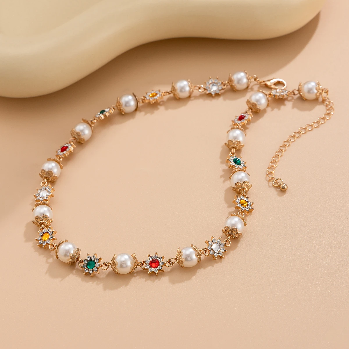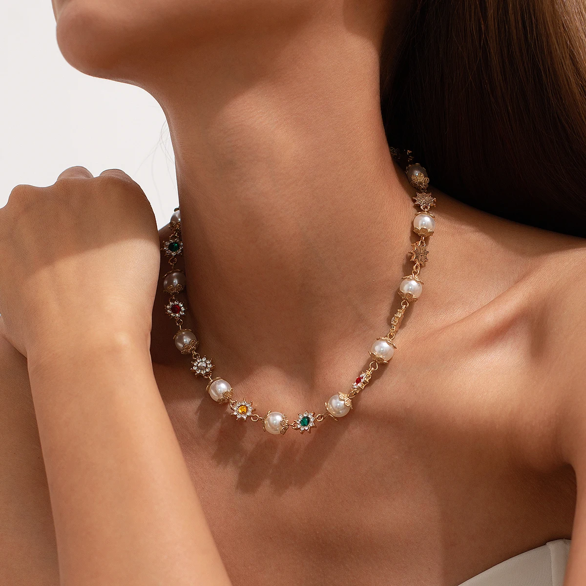 A constellation of frost-kissed rhinestone blossoms and pearl-like orbs dances along a gilded choker, each petal and sphere capturing light like dew under moonlight—this collar transforms décolletage into an Edwardian garden frozen in time. Delicate as lace yet radiant as stardust, the floral tapestry intertwines with creamy imitation pearls glowing with porcelain luster, all anchored by surgical-grade stainless steel that embraces throats with featherweight reverence. Hypoallergenic and eternally luminous, it defies tarnish while shifting seamlessly from bridal altars to midnight revelries: where vintage romance meets modern resilience, and every bloom whispers sonnets of timeless grace.