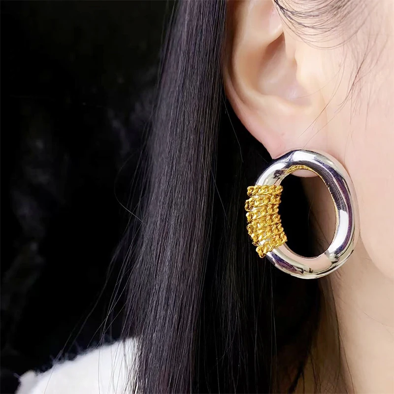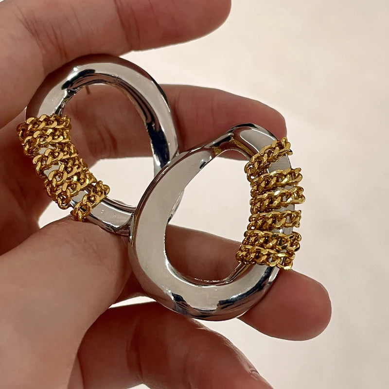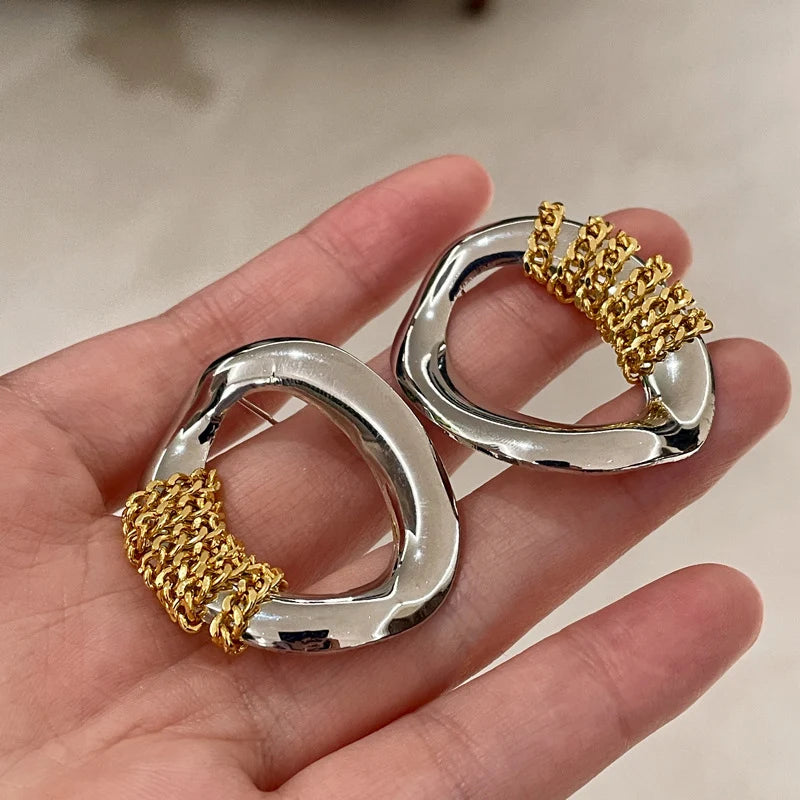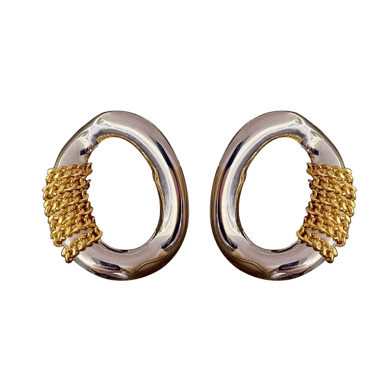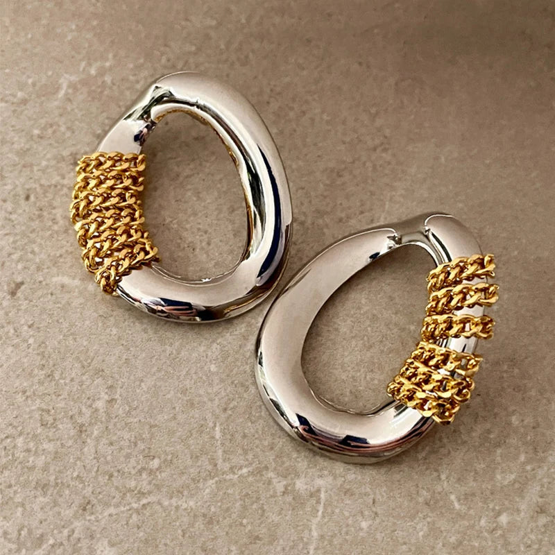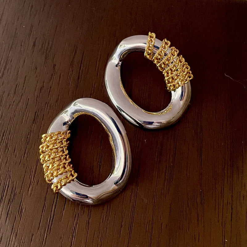 Where geometry dances with gravity, the Orbis Lumina Chainscapes redefine circular elegance. Meticulously crafted in 18K gold vermeil and rhodium-finished sterling silver, these earrings feature a fluid double-chain system suspended from a polished orb frame. The chains glide through smooth circular hoops like liquid metal, creating a mesmerizing play of light and shadow with every movement. A study in contrast: warm gold against cool platinum, structure against motion, restraint against rebellion.