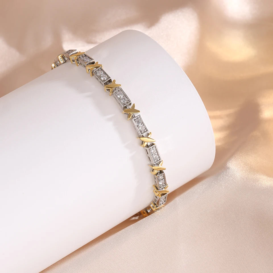 A sacred geometry of light—this audacious X-shaped bracelet weaves three gold tones into a tapestry of celestial radiance, each link encrusted with full-cut zircons that blaze like miniature supernovas. The angular silhouette wraps the wrist in architectural devotion, its alternating rose, yellow, and white gold plating creating a molten sunrise effect against skin. Weighty enough to feel like treasure yet engineered for all-night revelry, it’s a covenant of contrasts: where gothic edge meets jubilant sparkle, and the crossroads of love, faith, and destiny collide in a symphony of refracted light.